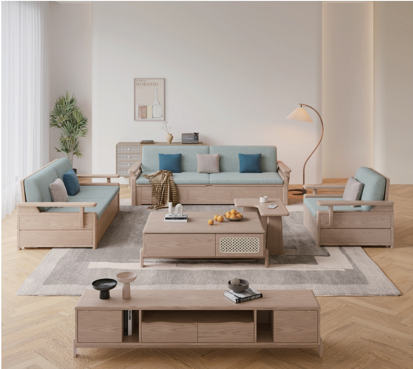 Minimal sofa family paired with rockboard tea table and TV cabinet.